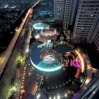 불규칙한 삼각형 구조에 각 세 모서리 부분을 오픈시켜 전방향에서 출입이 가능하고 바로 착석할 수 있도록 유도하고 있다. 위로는 중앙에 원형으로 뚫어져 있어서 답답하지 않게 하고 LED빛이 시간차로 여러 색을 띠며 은은하게 흐르고 있어 근사한 분위기를 연출한다.