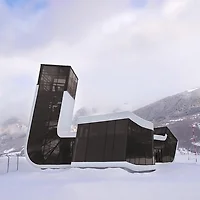 pulling up out of the urban landscape, the extension project is a seamless spiral form that features a mosaic of crystal-like excisions along its body.