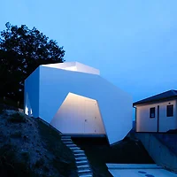 designed as a residence and cafe, the cubic volume is arranged around an irregularly-shaped void cut from one corner of the structure.