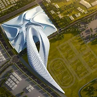 composed of four highly discernible volumes skewed off their axis, a number of pie-shaped balconies are generated on each level, expanding and enhancing the qualities of the interior.