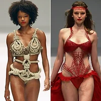 디자이너는 속이 비치는 검은색 레이스 천으로 모델들의 눈 부분을 가려, 매혹적이면서도 신비로운 분위기를 연출했다.