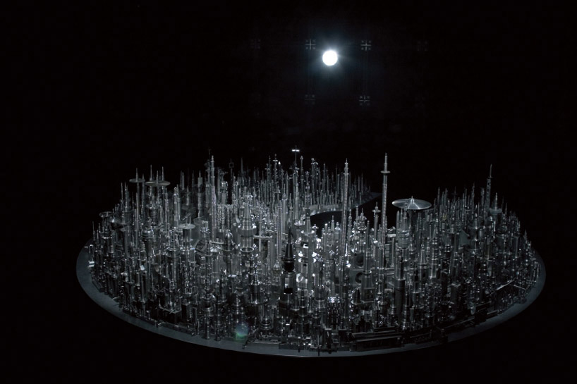 a futuristic, iron cityscape formed entirely by refurbished and polished scrap metal is intended to highlight the possibility for a more humanistic quality to a material typically associated with fatalistic purposes.
