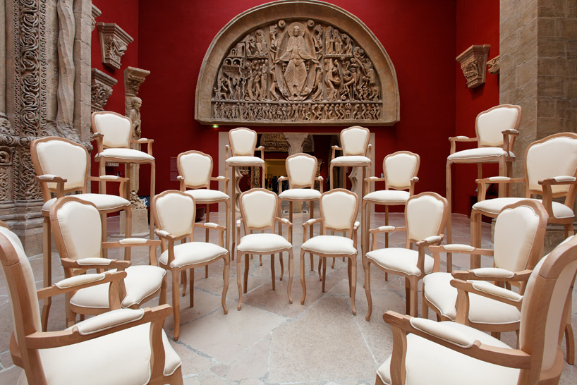 the installation is representative of a gathering of 'micro-nations' in which the chairs stand in for diplomats, each joining the conversation from a unique standpoint but seemingly on the brink of collapse.