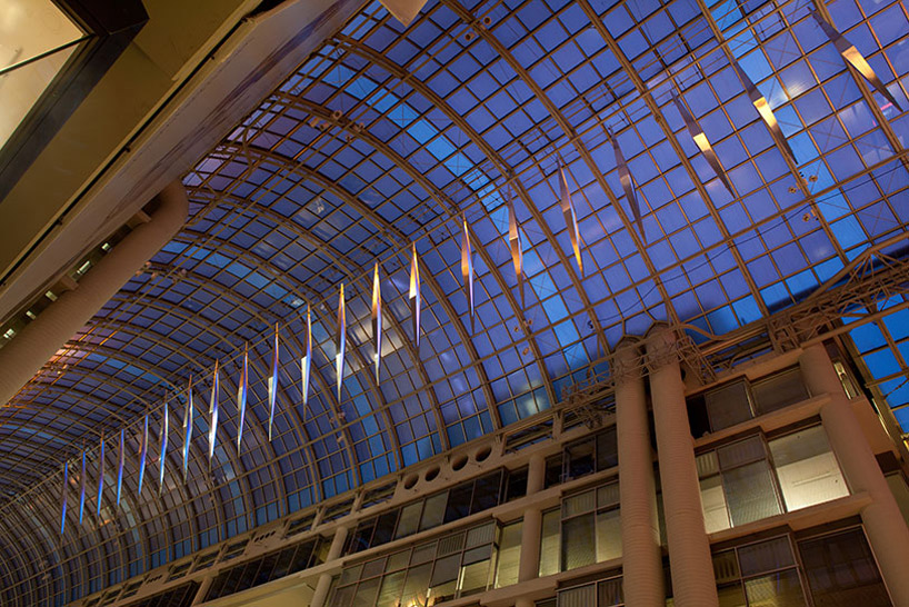 the color and luminosity of the sculpture changes in response to sun throughout the day, while at night, the prisms move from one shade to the next on their own accord.