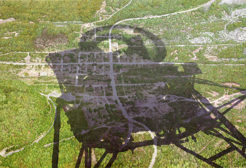 composed of diluted acrylic stains on muslin, the series highlights the 'casualties of technology' within the united states, depicting shadows of technological innovations hovering over the landscapes of toxic and abandoned towns.