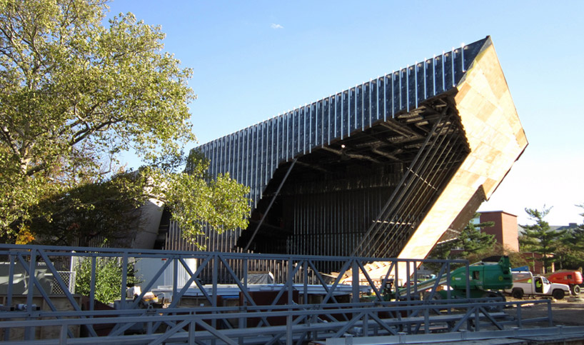 enclosed with a pleated stainless steel facade, this contemporary structure immersed within the traditional brick gothic campus is nearing completion in east lansing, michigan.