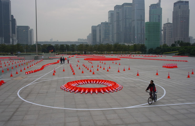 comprised of thousands of precariously balanced orange safety cones, 'china builds' is the biggest installation at the 2011 shenzhen & hong kong bi-city biennale of urbanism \ architecture.