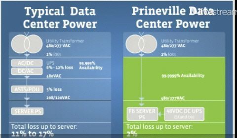 페이스북은 메인보드의 에너지 손실을 줄이는 것에 초점을 뒀다고 설명했다. 전체 데이터센터는 480볼트 전력 시스템을 갖고 있는데, 277볼트의 전력이 각 서버에 공급된다. 무정전 전원장치를 서버의 6개 랙에 집어넣었다.