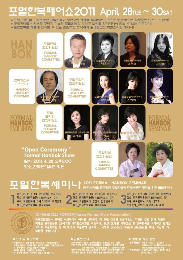 한국포멀협회는 오는 28~30일 삼청동 한벽원갤러리에서 '2011 포멀한복패션쇼'를 연다고 19일 밝혔다.