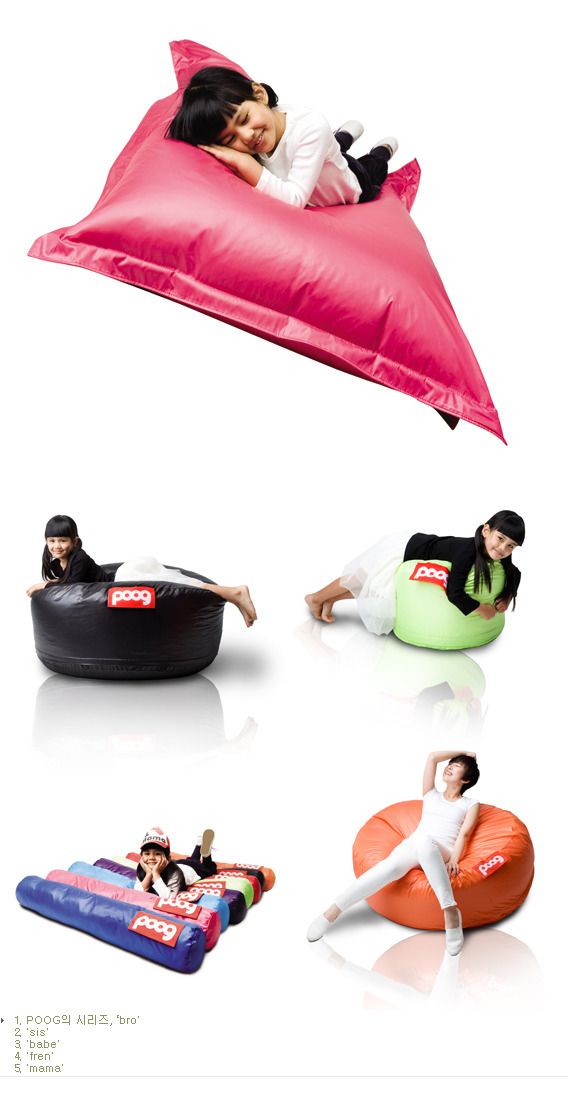 푹의 제품은 스퀘어, 라운드, 파이의 3가지 오리지널 디자인으로 구성된다. 어른이 걸터앉고 거의 누울 수 있는 1인용 소파인 ‘papa'와 ’mama', 그보다 조금 작은 사이즈로 어린이들이 사용하기에 좋은 ‘bro'와 'sis', 그리고 그보다 더 작은 크기로 제작된 ’babe‘와 길다란 쿠션 형태로 된 ’fren‘ 등이다.