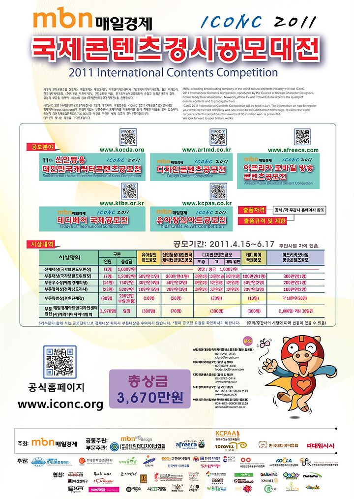 mbn 매일경제 주최로 진행되는 ‘2011 국제콘텐츠경시공모대전’의 다섯 개 공모전 중 하나로 열리는 이번 공모전은 그동안 캐릭터 디자이너들을 육성하는 데에 불모지 같았던 한국의 캐릭터 산업에 새로운 인재들을 선발하는 등용문이 될 것으로 기대된다.