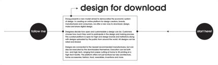 드로흐(Droog)도 이와 유사한 개념의 프로젝트를 진행 중이다. 올해 말 문을 열 www.make-me.com은 ‘다운로드 가능한’ 디자인을 위한 플랫폼이다. 오픈 디자인과 디지털의 가능성을 토대로, 디자이너와 제조사, 소비자를 위한 플랫폼을 마련한다는 것이 드로흐와 미디어길드(Mediagilde)의 목표다.