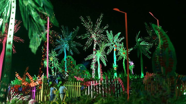a cut-out animation featuring miniature set designs created with materials such as paper, fabrics, acrylic, natural elements etc., executed in a 'dayglo painting' style.