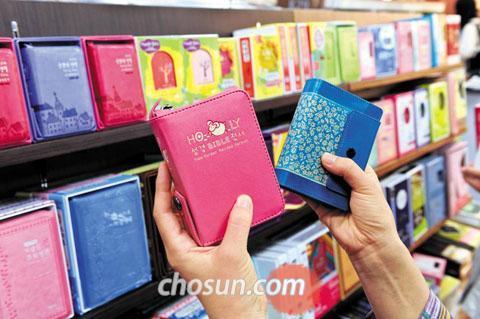 회사원 김유정(39)씨는 한영(韓英)성경을 사러 서울 광화문 교보문고에 갔다가 화들짝 놀랐다. 성경의 종류가 매대 하나를 다 차지할 만큼 다양했기 때문이다. 색상은 무지개 색깔로 화려하고, 크기도 아주 큰 것부터 손바닥만 한 미니 성경까지 수십 종이다. 지갑인 줄 알고 열어보니 초미니 성경책이 들어 있다. 한영성경만 해도 예닐곱 군데 출판사들이 각기 고안해낸 디자인을 뽐내며 진열돼 있어 고르는 데만도 30분이 넘게 걸렸다. "성경으로 영어 공부 좀 해볼까 하고 사러 간 건데 이렇게 많은 종류의 성경책이 있는 줄 몰랐어요."