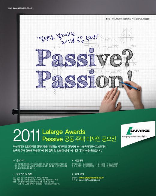 한국라파즈석고보드는 건축물의 혁신과 새로운 아이디어 적용을 위해 ‘2011 패시브(Passive) 공동주택 디자인 공모전’을 개최한다고 30일 밝혔다.