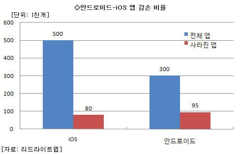 역시 같은 자료에 따르면 약 50만 개에 달하는 iOS용 앱 중 8만 개 가량이 사라졌다. 비율로 따지면 안드로이드 진영의 절반 되는 16% 정도 된다.