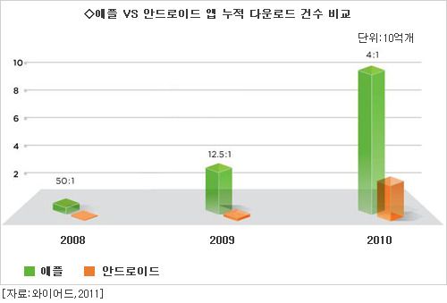 일단 두 진영의 앱 다운로드 건수를 한번 살펴보자. 지난 해 말 현재 애플 앱 다운로드 누적 건수는 100억 개에 육박했다. 반면 안드로이드 진영은 애플의 4분의 1 수준에 머물렀다.