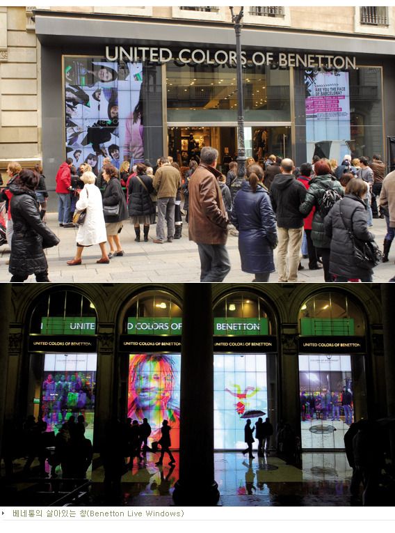 가장 최근 프로젝트인 ‘베네통의 살아있는 창(Benetton Live Windows)’을 예로 들어 보겠습니다. 이 프로젝트는 전 세계 베네통의 플래그십 스토어에 적용할 미디어 프로젝트로 지금까지는 밀라노, 뮌헨, 바르셀로나, 상하이, 모스크바에만 설치되어 있습니다.