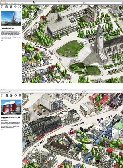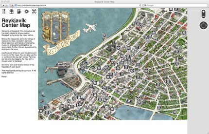 아이슬란드의 수도 레이캬비크(Reykjavík)의 모습이 아름다운 손그림 지도 속에 담겼다. ‘레이캬비크 도심 지도(Reykjavík Center Map)’ 웹사이트가 문을 열었다. 지도는 레이캬비크 중심가의 모습을 집 한 채, 나무 한 그루까지 충실히 재현하였다. 일일이 손으로 지도 이미지는, 굳이 거리 사진을 빌지 않아도 될 만큼 충분히 상세하다. 그러니 지도 제작에 오랜 시간이 걸린 것도 당연하다. 보르가민드(Borgamynd)의 건축가, 그래픽 디자이너, 프로그래머들이2년 동안 ‘레이캬비크 도심 지도’ 제작에 매달렸다고. 지도 위로는 도시 관광객들을 위한 정보들이 펼쳐져 있다. 방문해 볼 만한 명소, 식당, 상점, 기타 여행 관련 시설들이 아이콘으로 표시되어 있으며, 아이콘을 클릭하면 해당 장소의 실제 사진과 상세 정보가 페이지 왼쪽에 나타난다. 공들인 그림 관광 지도. 조만간 보르가민드는 ‘레이캬비크 도심 지도’의 모바일 버전 및 온라인 스토어도 선보일 예정이라고.
