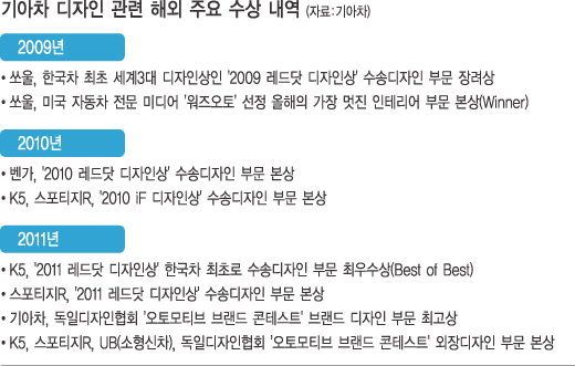 앞서 K5는 올 3월 세계 3대 디자인상 중 하나인 ‘2011 레드닷 디자인상’에서 한국차 중 최초로 수송디자인 부문에서 최우수상을 받았다. 지난해에도 K5와 스포티지R는 세계 3대 디자인상인 ‘2011 iF 디자인상’과 미국의 ‘2010 굿디자인 어워즈’에서 각각 본상을 받았다. 쏘울과 유럽 전략차종인 벤가도 2009년과 2010년 ‘레드닷 디자인상’과 ‘iF 디자인상’ 본상을 받았다.