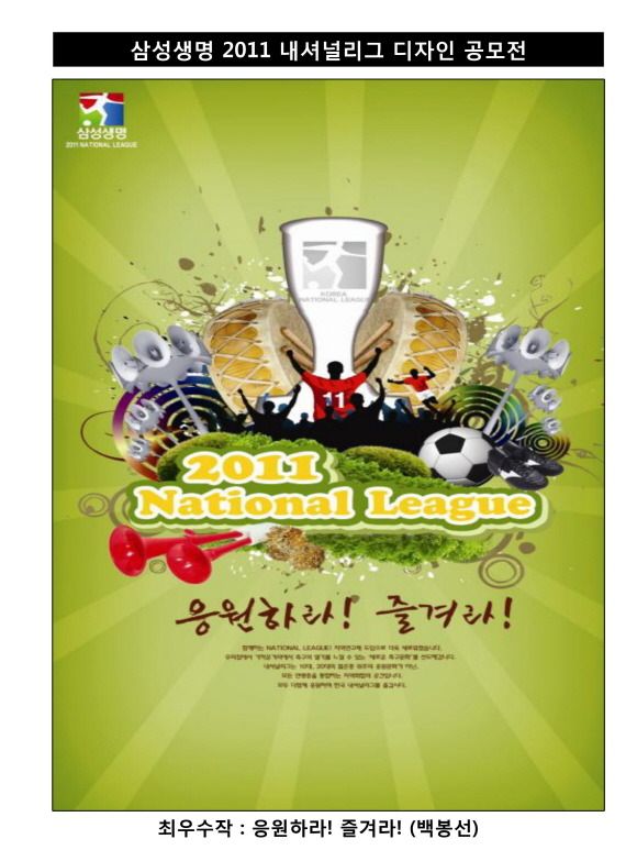 KOREA NATIONAL LEAGUE(회장 권오갑)는 2011 내셔널리그 디자인 공모전을 운영하여 ‘응원하라! 즐겨라!’의 주제로 디자인 공모전에 참가한 백봉선씨 작품을 최우수작으로 선정하였다. 2011년도 내셔널리그의 라라라(알려라, 잡아라, 모여라)프로젝트의 일환으로 진행된 이번 공모전은 내셔널리그의 발전적인 이미지를 담은 포스터 공모를 통해 참신한 리그 발전의 이미지를 표출하기 위해 마련됐다.