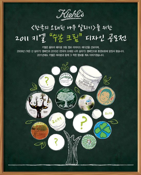2011 키엘 수분 크림 디자인 공모전의 1등 당선작은 전 세계적으로 15초에 1개씩 판매되는 키엘의 No.1 베스트셀러 수분 크림인 '울트라 훼이셜 크림'의 2011년 한정판으로 제작되어 전국 키엘 매장에서 판매되며, 수익금 중 일부는 '한국의 오래된 나무 살리기' 캠페인의 후원금으로 사용될 예정이다.