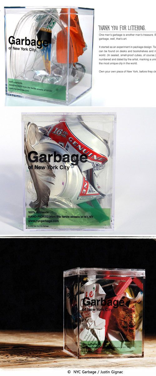 저스틴 기그낵은 뉴욕의 거리에서 쉽게 발견할 수 있는 지하철표, 스타벅스 빨대, 버려진 사진, 깡통, 나뭇조각, 풍선 등등 '진짜 쓰레기'들을 투명 박스에 담아 '예술품'으로 판매하고 있는데, 해외 판매가는 50달러 내지 100달러라고 한다.
