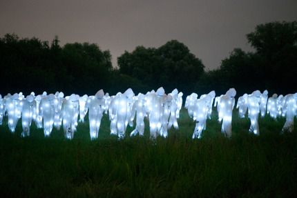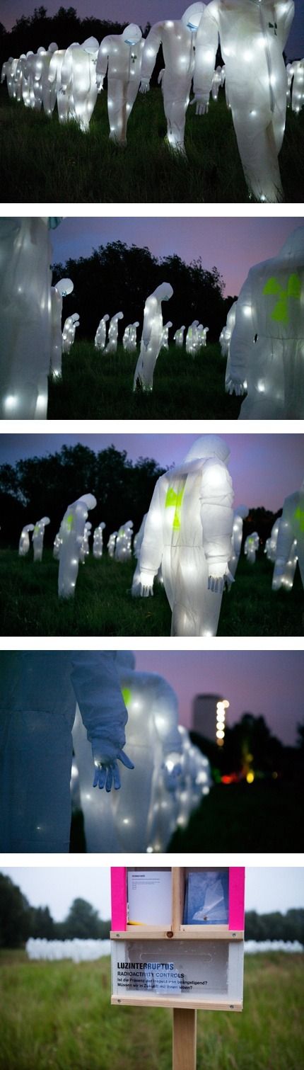 초록빛 풀밭 한복판, 작업복을 입은 100명의 "방사능 병정"들이 어딘가로 향해 간다. 등판의 방사능 표시와 몸 안에서 뿜어져 나오는 빛이 어딘가 불안하다. 루스인테르툽스(Luzinterruptus)의 최근작 ‘방사능 제어(Radioactive Control)’의 모습이다. 빛(luz)으로 도시 공간 곳곳에 개입해왔던 그들이, 이번 작업에서는 당면한 방사능 위기를 정면으로 겨냥한다. 지난 3월 대지진과 쓰나미로, 원전 안전신화 역시 무너졌다. 루스인테룹투스는 인스톨레이션을 통해 방사능에 대한 공포를 시각화하는 한편, 원자력 에너지의 이용과 남용에 관해 다시 생각해 보게 한다. 루스인테르툽스의 ‘방사능 제어’는 지난 달, 함부르크에서 열린 독빌 페스티벌(Dockville Festival)에서 전시되었다.