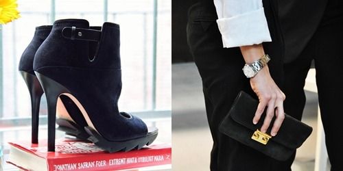 블랙 컬러의 심플한 클러치를 록무드를 나타내는 액세서리를 매치하거나 블랙 스웨이드 킬힐을 신어 시크하고 매니시한룩을 완성할 수 있다.