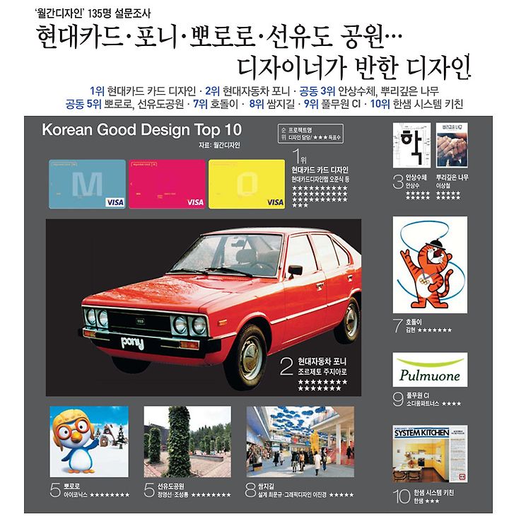 설문 결과 '현대카드 카드 디자인'이 33표를 얻어 1위를 차지했다. "색과 알파벳의 명쾌한 시각적 기호를 카드에 도입해 기업의 보수적인 이미지를 탈바꿈시켰다"는 평이 주를 이뤘다. 2위는 15표를 얻은 현대자동차 '포니'였다. 1974년 이탈리아 디자이너 조르제토 주지아로가 디자인한 포니는 똑똑 떨어지는 직선 스타일의 모던한 디자인이 인상적인 것으로 평가됐다.