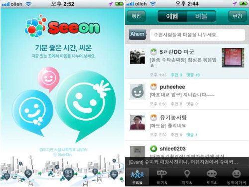 [뉴스핌=홍승훈 기자] 위치기반 SNS기업 씨온(대표 안병익, www.seeon.kr)이 어플리케이션의 UI디자인과 커뮤니티, 사용자간 관계 기능을 강화한 새로운 버전을 공개했다.