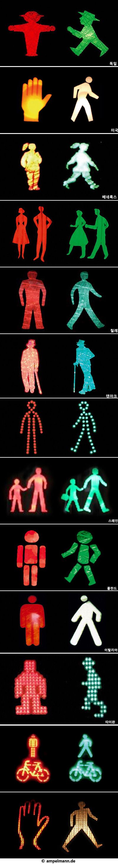 서인도 제도에 있는 과둘루프에서는 점을 이어서 사람을 표현했다. 스페인의 신호등 사람 이미지는 손을 잡은 부자 또는 부녀의 모습이다. 그리고 오스트리아의 신호등 이미지에는 자전거도 포함되어 있어 이색적이고 맨 아래 캐나다 신호등 이미지는 미국의 것을 닮았다.