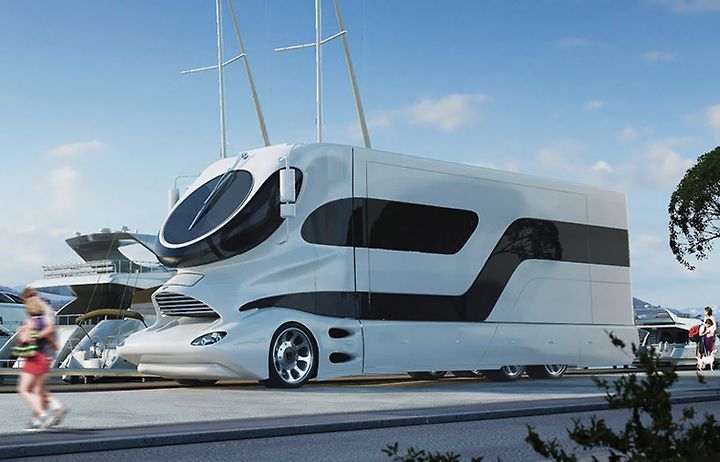 measuring 38 feet (11.6 meters) long with a cab based on luigi colani's design, the 3-model 'elemment' series includes the luxury mobile home 'palazzo', with its bedroom, bathroom, lounge, and pop-up rooftop 'sky lounge'.