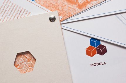 얀 슬로트하우버와 빌리암 흐라츠마에게 큐브 모듈이 거의 모든 작업의 기초였던 것처럼, 에프라임 에베르트섀우저(Ephraim Ebertshäuser)의 콘셉트 ‘모듈라(Modula)’에 대해서도 비슷한 이야기를 할 수 있을 것이다. ‘모듈라’는 가상의 모듈식 가구 브랜드를 위한 작업으로, 그에 걸맞는 로고와 브로셔, 서체 디자인으로 이뤄져 있다. 로고가 보여주듯 핵심은 모듈성의 반영에 있다. 몇 개의 큐브들로 이뤄진 로고가, 자연스레 브로셔와 타이포그래피 디자인의 기초를 이룬다.