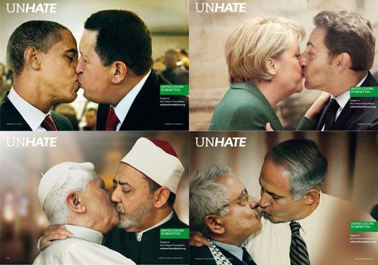 베네통은 `언헤이트(Unhage)` 캠페인 광고 시리즈의 하나로 이명박 대통령과 김정일 북한 국방위원장은 물론, 오바마 미국 대통령과 후진타오 중국 국가주석, 메르켈 독일 총리와 니콜라 사르코지 프랑스 대통령, 교황 베네딕토 16세와 이집트의 이슬람 최고 종교 지도자(그랜드셰이크) 아흐메드 엘 타예브가 각각 키스를 나누는 합성 사진을 공개했다.