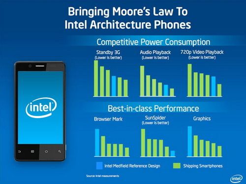 인텔의 견본품에 탑재된 모바일 프로세서는 인텔 아톰 아키텍처에 기반을 둔다. ‘메드필드’라는 이름이 붙은 인텔의 모바일 프로세서는 32nm 공정이 적용된 저전력 제품이다. 인텔은 모바일 기기가 복잡한 작업을 수행할 때 경쟁 업체의 모바일 프로세서보다 상대적으로 적은 전력을 소모한다는 점을 장점으로 내세우고 있다. 웹브라우징이나 동영상 재생과 같은 작업이 대표적이다.