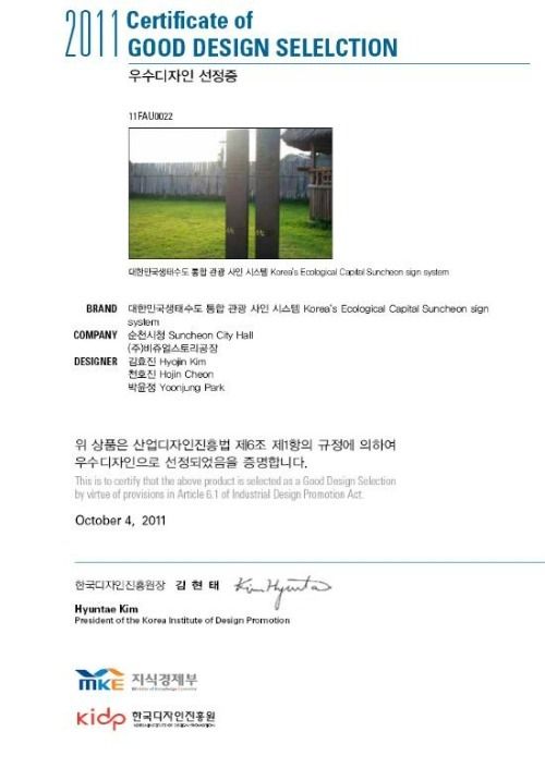 대한민국생태수도 순천 통합 관광사인 시스템이 지식경제부가 주최하고 한국디자인진흥원이 주관하는 공모 사업에 2011 우수디자인으로 선정됐다.