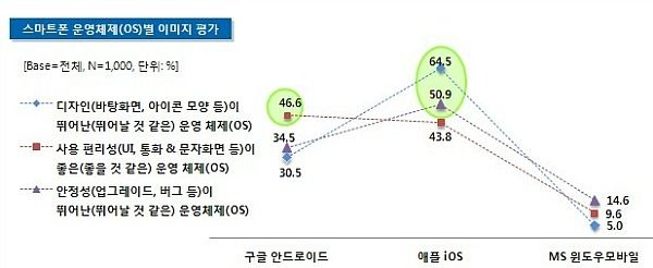 각 운영체제 별 이미지 평가에서는 디자인과 안정성은 iOS가, 사용 편리성은 안드로이드가 좋은 평가를 받고 있었다. 디자인이 뛰어난 운영체제를 묻는 질문에는 전체 64.5%가 iOS를 꼽아, 안드로이드(30.5%)와 윈도우모바일(5%)을 크게 앞질렀다.