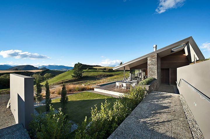 positioned at the base of the wanaka valley, new zealand, the linear footprint of this residence provides sweeping views of the mountain peaks and rolling farmland from every room. |