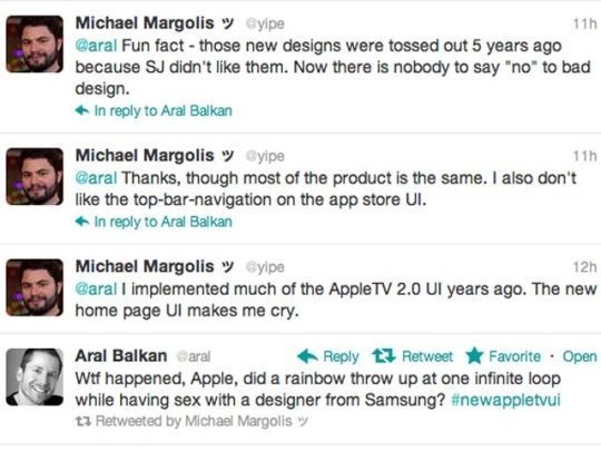 그는 “나는 여러해 전(애플 시절)에 애플TV 2.0을 설치한 바 있다. 새 애플TV홈페이지는 나를 미치게 만든다”는 트윗도 날리고 있다. 또 “난 특히 앱스토어 UI에 있는 톱바 내비게이션이 싫다”고도 적었다.
