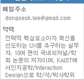 [4인 4색, UX를 말하다-4] 이지현 서울여대 산업디자인학과 교수 칼럼니스트 : 이지현 메일주소 rick0109@gmail.com 약력 UX 분야의 중요성과 가치, 전문성과 깊이를 스스로 성찰하고 업계에 전파하고자하는 프론티어. KAIST에서 인간중심디자인, 인터랙션 디자인으로 학/석사 학위를받고 Aalto 대학에서 IDBM(디자인 경영 협동 과정)으로 EMBA를 취득하였다.NHN과 FID(인터넷 컨설팅 그룹 겸 웹에이전시)에 UX 관련 조직을 설립하고발전시켰으며 한국, 미국에서 웹서비스, 소프트웨어, 온라인 게임, 모바일 기기및 서비스, IPTV, 가전제품, 공공 정보 시스템에 이르는 다양한 영역의 UX프로젝트를 리딩해 왔다. 현재 미래의 UX 서비스 경험에 관심을 가지고서울여자대학교 산업디자인학과..